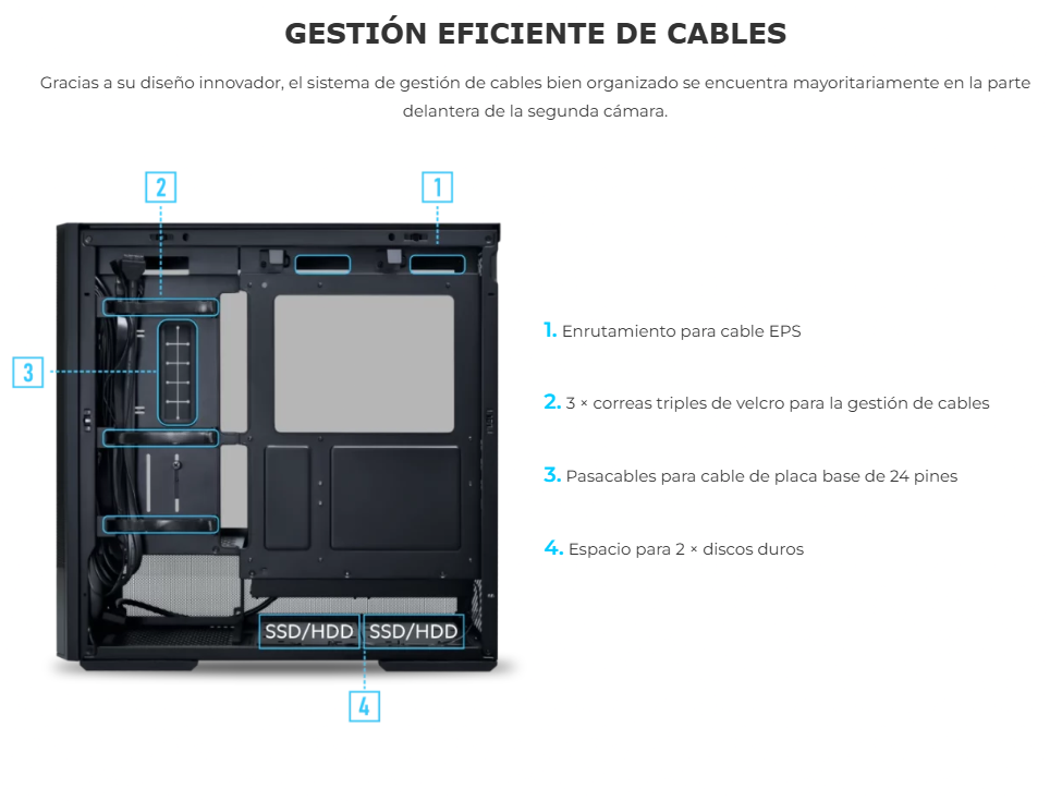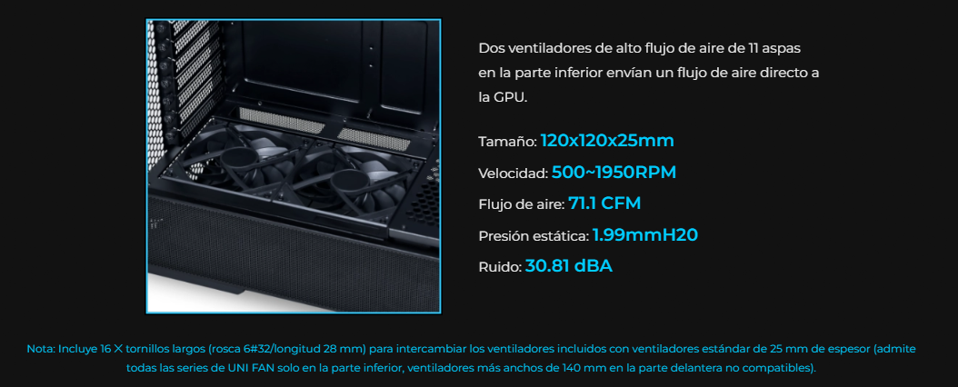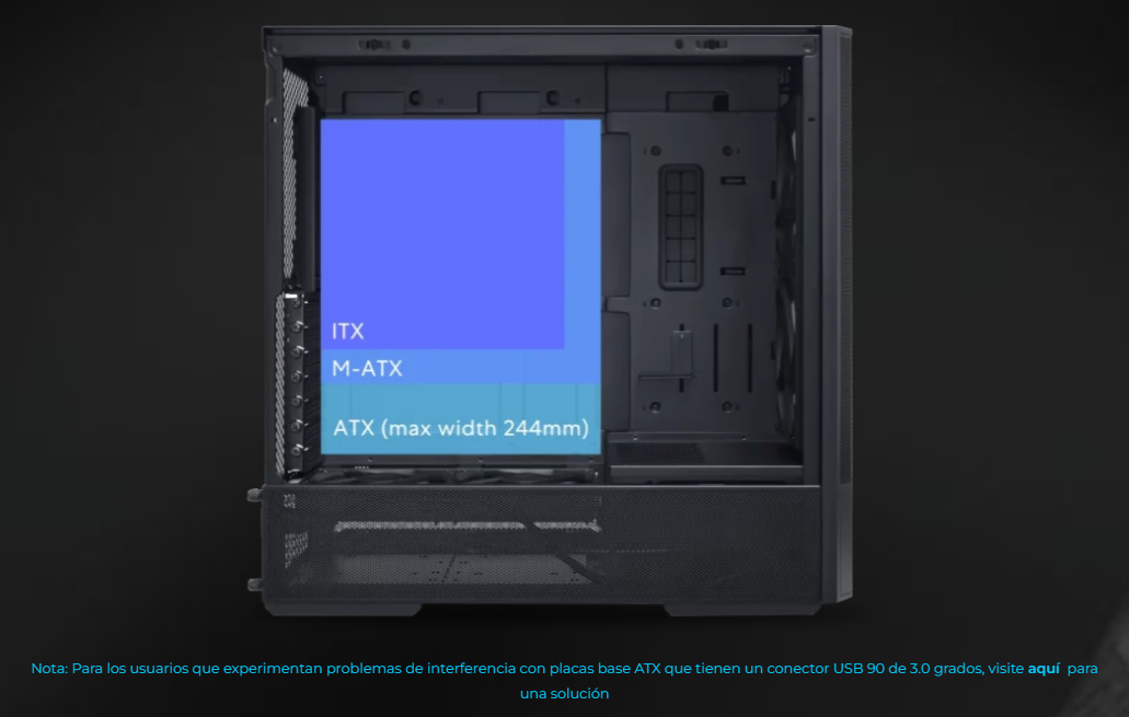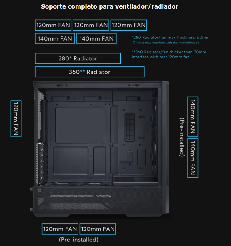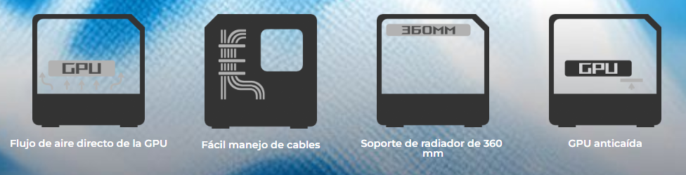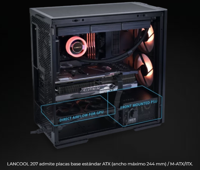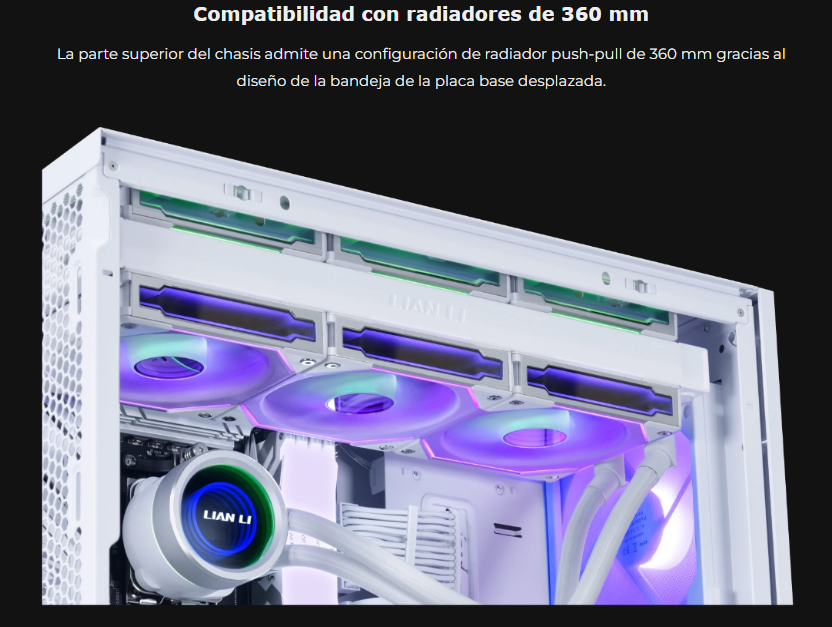 • Se rediseñó la posición de la bandeja de la placa base para mejorar el espacio libre del radiador superior y ubicar los ventiladores inferiores directamente debajo de la GPU para una mejor refrigeración