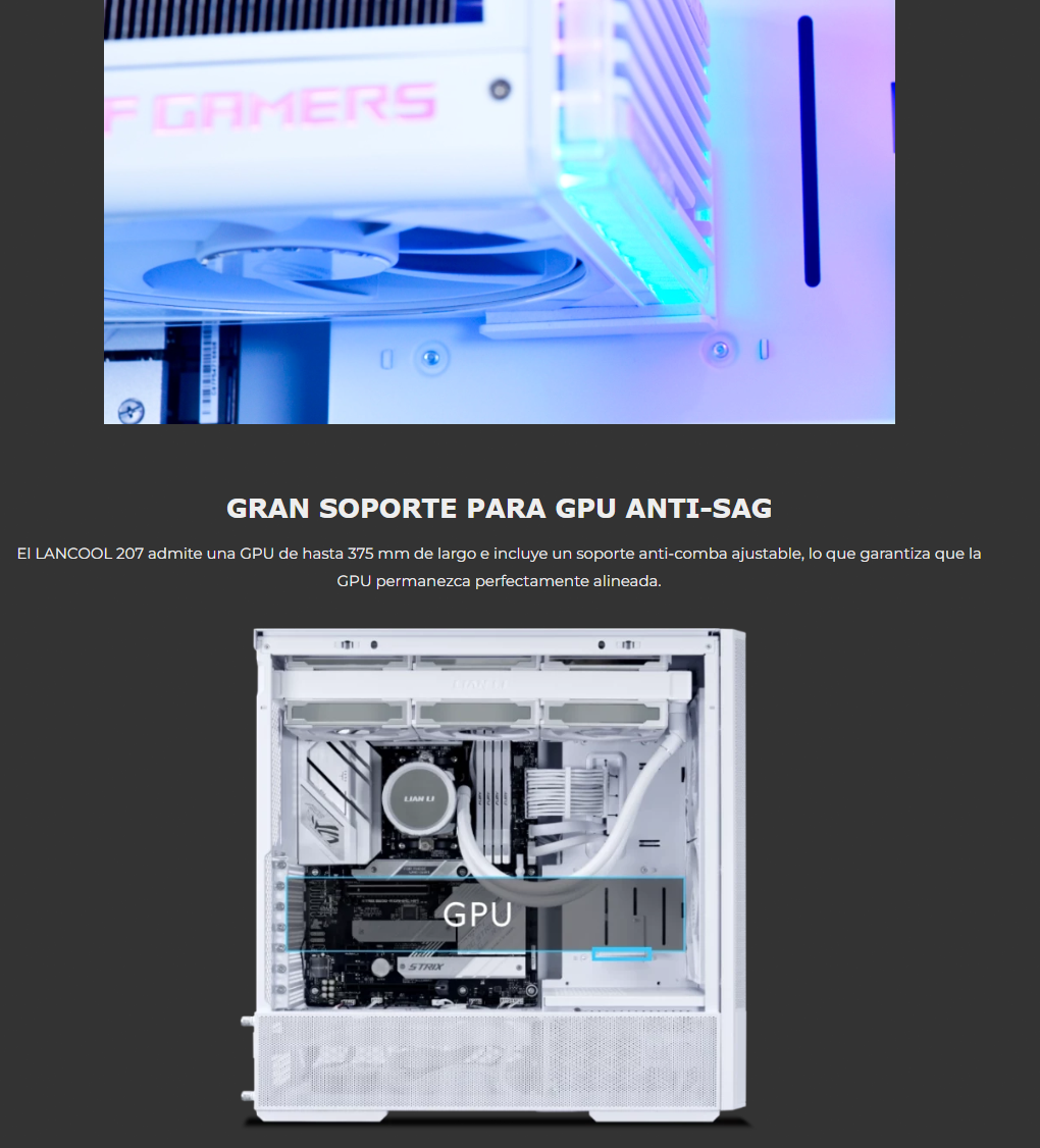 • Soporte anti-hundimiento de GPU con ajuste vertical y horizontal para soportar diferentes GPU
