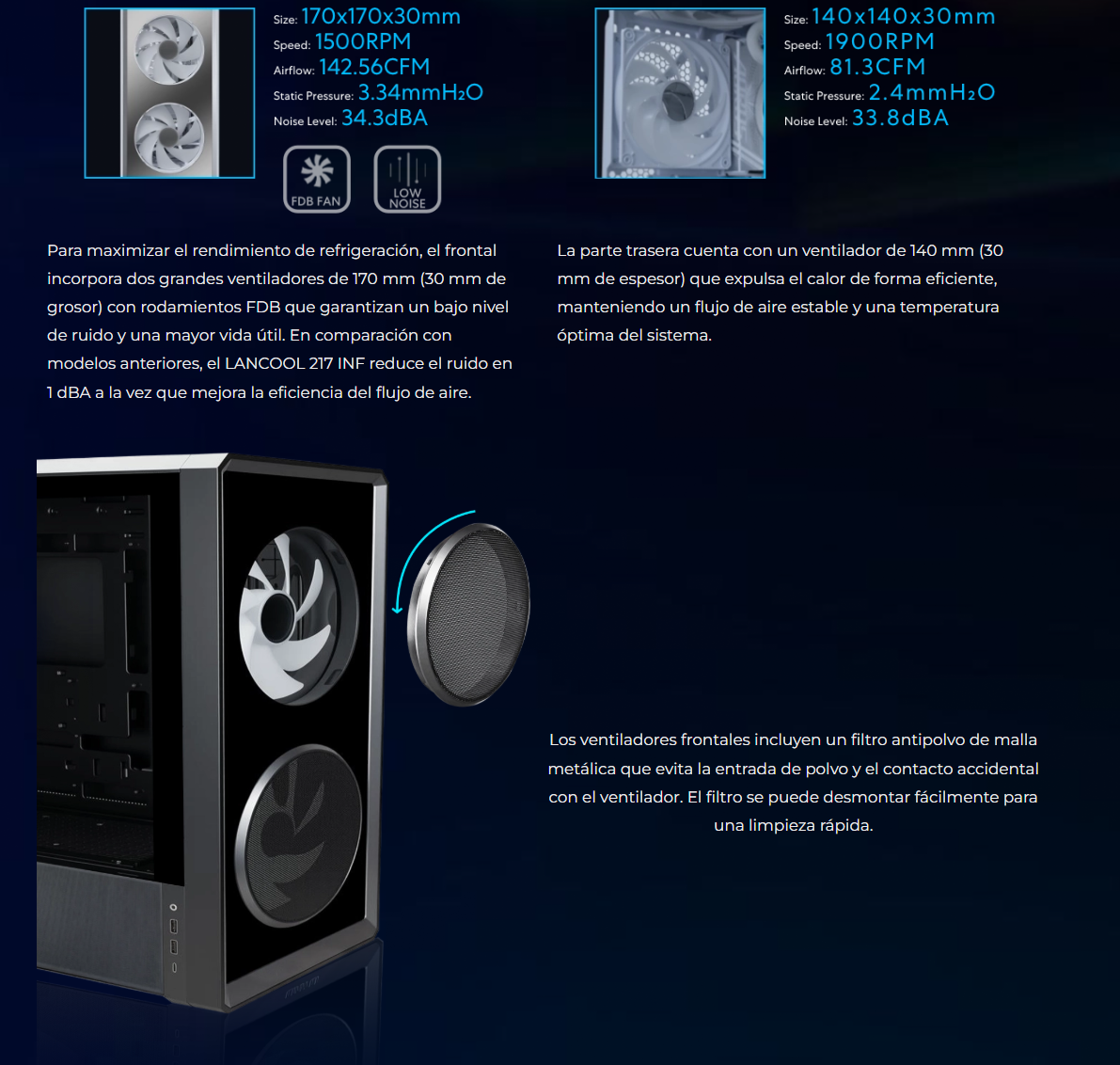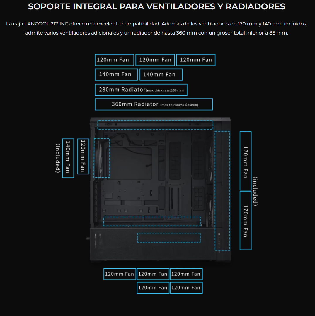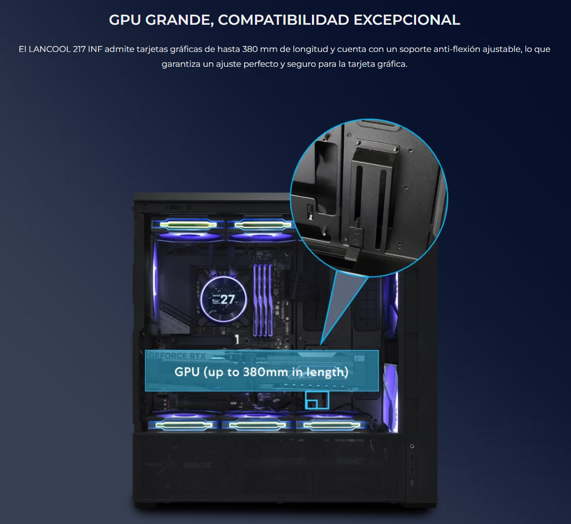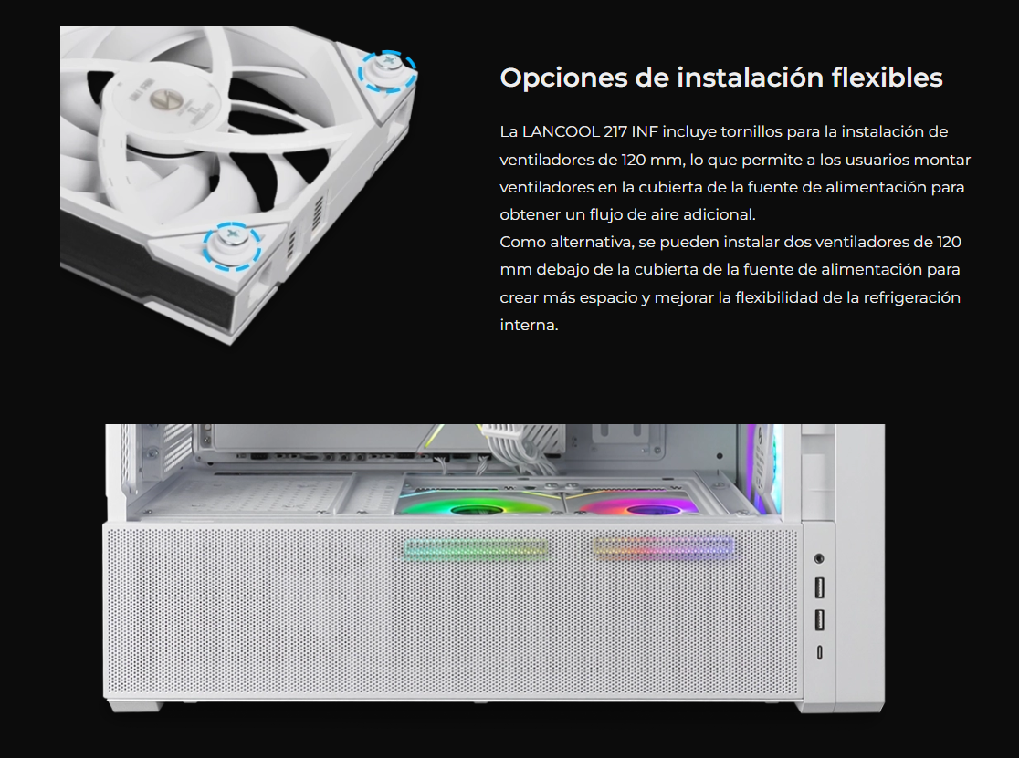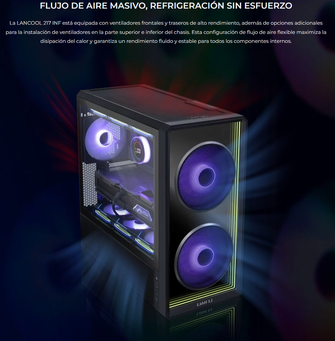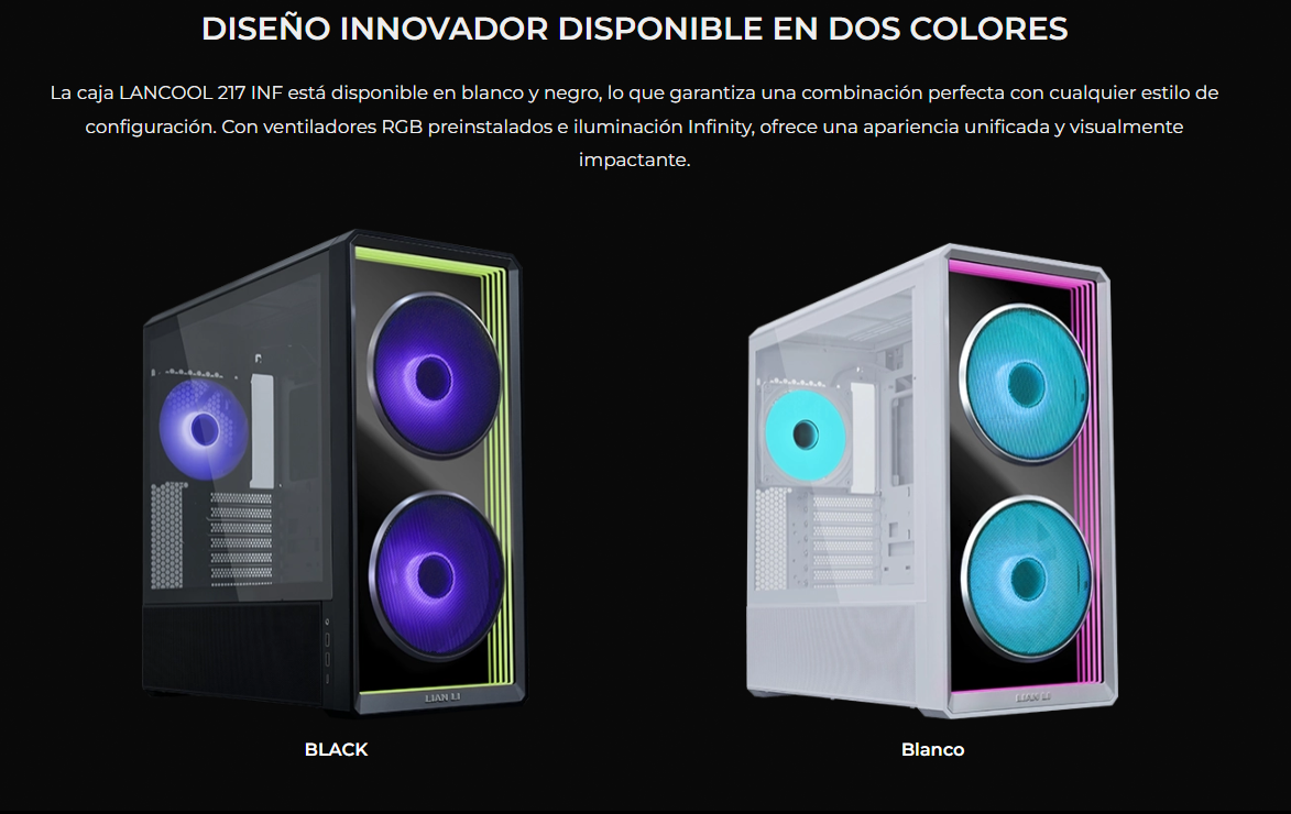El LANCOOL 217 INF continúa con nuestro diseño característico de flujo de aire de alta eficiencia con un panel frontal de espejo infinito para un efecto visual impactante, mientras que las aberturas dobles de vidrio templado garantizan un flujo de aire amplio.