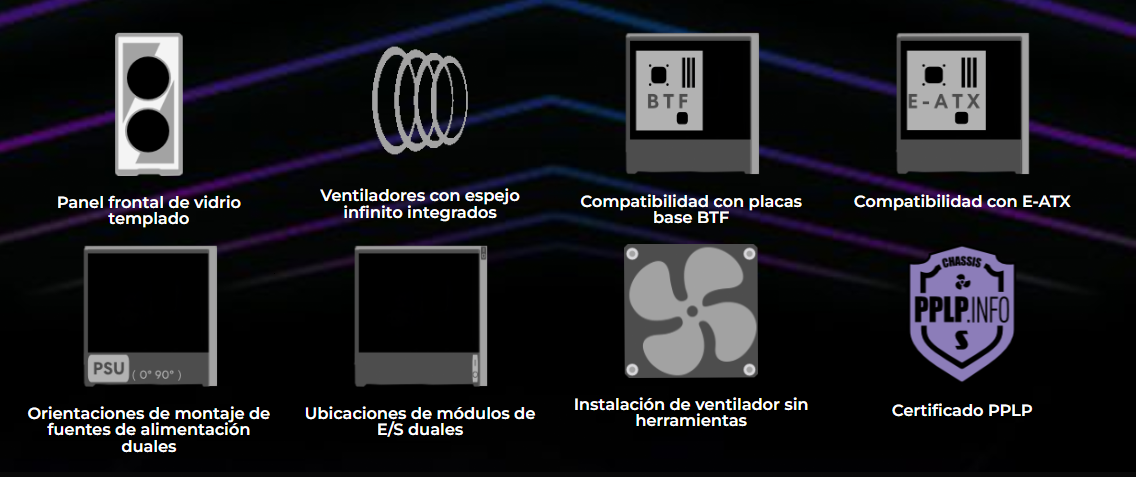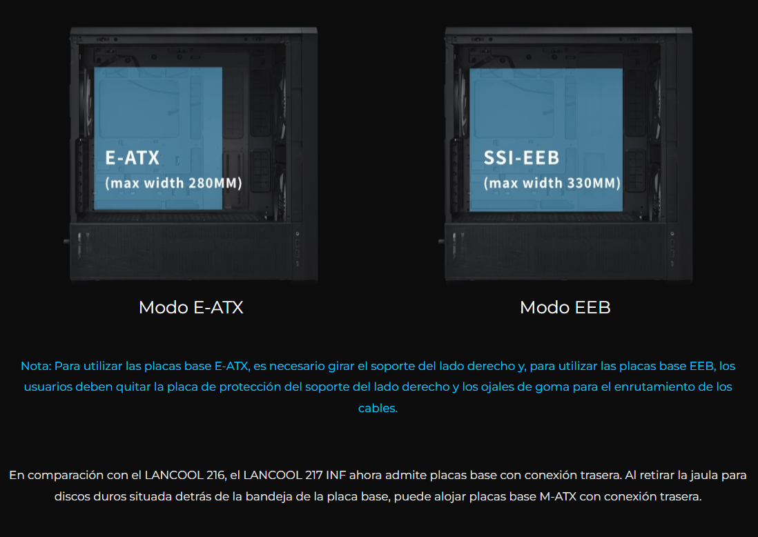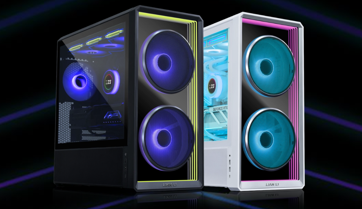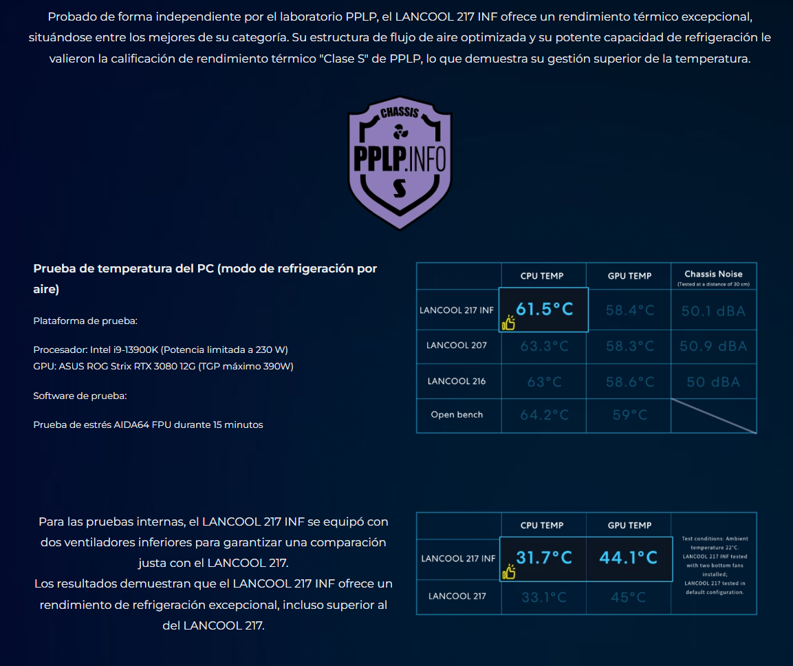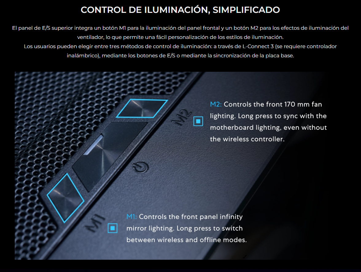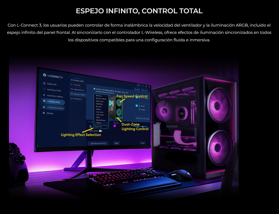 El LANCOOL 217 INF continúa con nuestro diseño característico de flujo de aire de alta eficiencia con un panel frontal de espejo infinito para un efecto visual impactante, mientras que las aberturas dobles de vidrio templado garantizan un flujo de aire amplio.