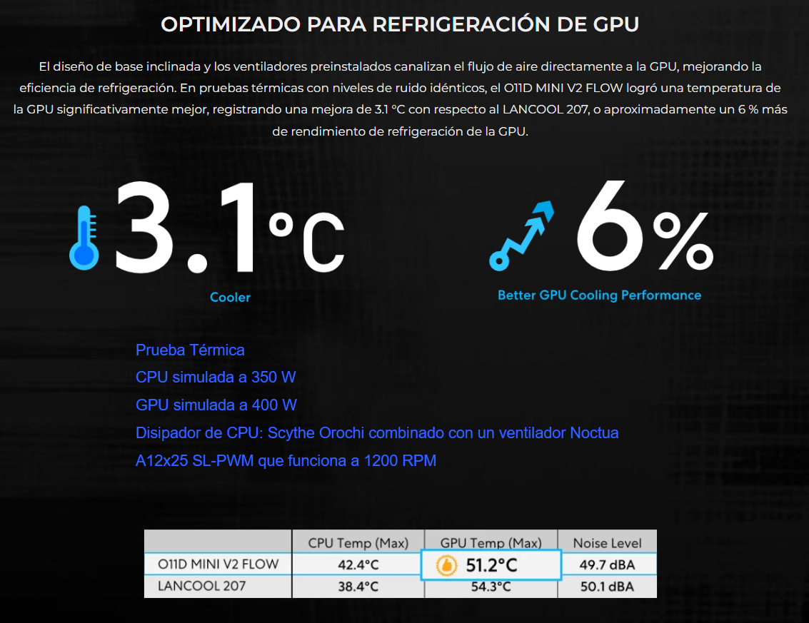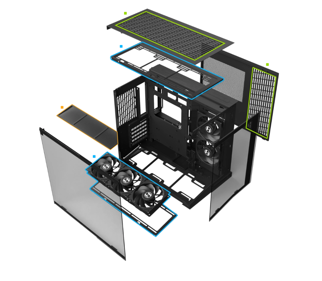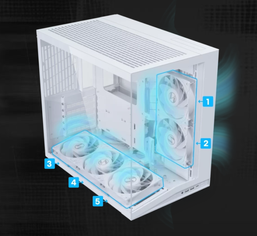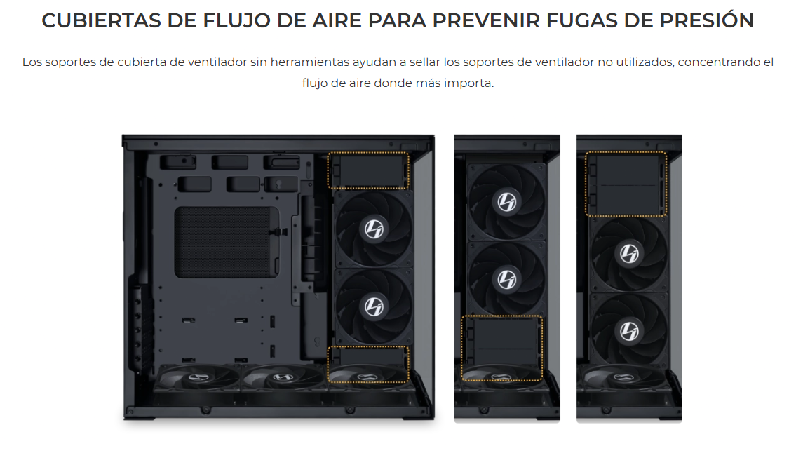 • Admite radiador superior de hasta 360 mm, radiador lateral de 240 mm y 9 ventiladores de 120 mm